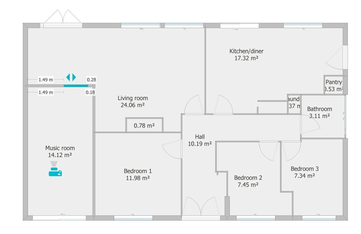 This is an approximate floor plan of the bungalow which will require precise dimensions at the time of sale. However, it provides a very good overview. The front of the bungalow is the living room and the kitchen/diner.